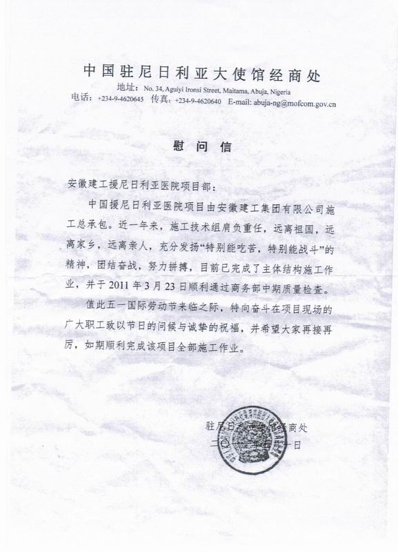 中國駐尼日利亞使館經商處于“五一”國際勞動節向我援尼日利亞醫院項目部發來慰問信,向奮斗在項目施工現場的安徽建工集團廣大職工表示節日的祝福和問候。