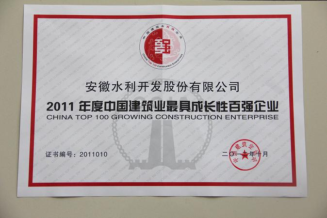10月22日,從2011年度中國(guó)建筑業(yè)企業(yè)雙百?gòu)?qiáng)暨2012年度全國(guó)建筑業(yè)AAA級(jí)信用企業(yè)發(fā)布會(huì)上傳來喜訊,安徽水利榮獲2011年度中國(guó)建筑業(yè)最具成長(zhǎng)性百?gòu)?qiáng)企業(yè)第十名。