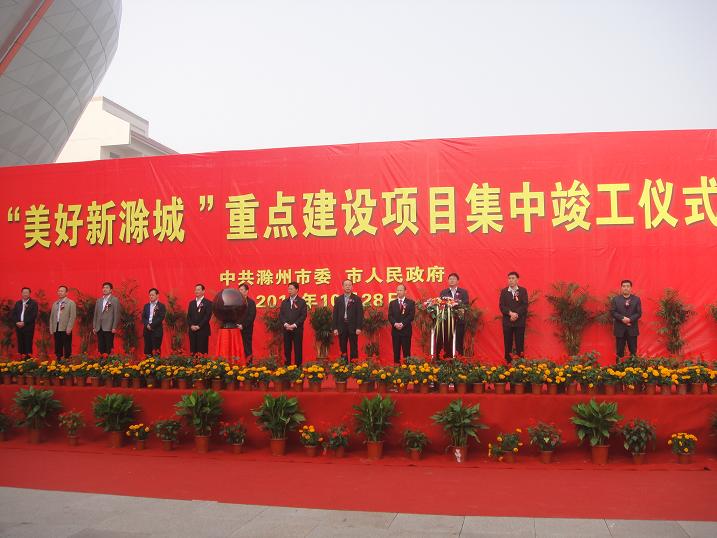 竣工儀式上,滁州市委書記江山,市長張祥安,安徽建工集團黨委副書記、副董事長、總經理、安徽水利董事長趙時運共同啟動“美好新滁城”重點建設項目集中竣工禮儀球。儀式結束后,江山書記、張祥市長在趙總的陪同下饒有興致地參觀了體育館,市領導對體育館的如期建成,對公司為此付出的巨大努力,給予了充分肯定和高度評價。