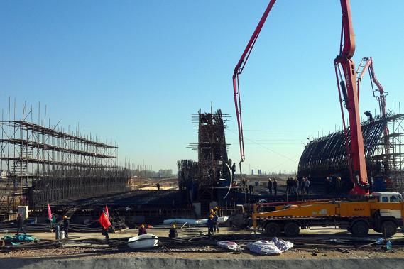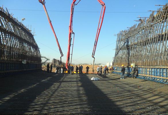 南水北調(diào)中線工程第八標(biāo)段的渡槽工程自開工建設(shè)以來(lái),克服了汛期、暴雨、施工難度大等眾多困難,于11月5日上午9:16分正式開始澆筑。賈河渡槽單體槽深身凈寬13m,底板支座斷面厚1.15m,槽體高支座斷面為8.93m。渡槽結(jié)構(gòu)復(fù)雜,施工難度大,為保證澆筑成功,圍繞首跨渡槽澆筑,項(xiàng)目部對(duì)主要人員進(jìn)行技術(shù)交底,將每項(xiàng)工序劃定責(zé)任到每位振搗人員、施工班長(zhǎng)、質(zhì)檢員身上,并制定24小時(shí)值班負(fù)責(zé)表。澆筑采用2臺(tái)泵車以分段分段層的順序,左右側(cè)混凝土對(duì)稱下料,連續(xù)澆筑的方式進(jìn)行。經(jīng)過(guò)相關(guān)部門的緊密配合,于在11月6日凌晨4:17分順利完成了賈河渡槽第一跨右幅底板混凝土澆筑工作,為今后澆筑工作順利展開做了充實(shí)準(zhǔn)備。