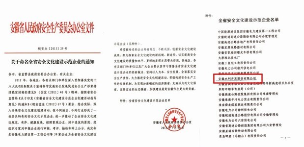 2013年7月31日,從安徽省安全生產(chǎn)委員會(huì)辦公室召開的表彰大會(huì)上傳來喜訊,安徽水利被命名為“安徽省安全文化建設(shè)示范企業(yè)”,成為全省被命名的39家企業(yè)為之一。