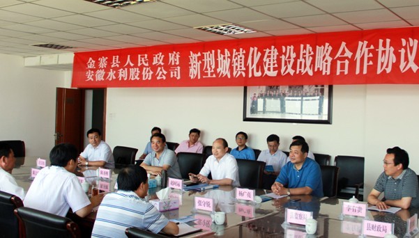 2013年8月1日上午,安徽水利與金寨縣人民政府在金寨縣政府九樓會議室舉行簽約儀式,簽署《新型城鎮(zhèn)化建設(shè)戰(zhàn)略合作協(xié)議》,就金寨縣縣城及現(xiàn)代產(chǎn)業(yè)園區(qū)舊城改造、新區(qū)開發(fā)、保障性住房、道路橋梁、河道治理等138億重點建設(shè)項目進行投資合作。安徽水利總經(jīng)理楊廣亮和金寨縣常務(wù)副縣長李衛(wèi)東代表雙方簽約。六安市委常委、金寨縣委書記潘東旭、常務(wù)副縣長李衛(wèi)東,安徽建工集團黨委書記、董事長、安徽水利董事長趙時運,安徽建工集團董事、安徽水利總經(jīng)理楊廣亮,安徽水利常務(wù)副總經(jīng)理陳圣剛,安徽建工集團財務(wù)資產(chǎn)部主任李有貴、安徽路橋公司董事長汪衛(wèi)東等出席簽約儀式。