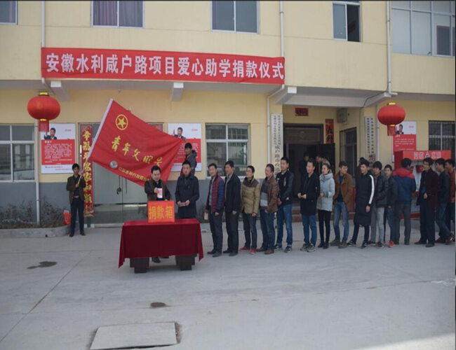 “安徽水利愛心助學基金”是經安徽水利黨委批準,公司團委牽頭成立的一項公益助學基金,成立于2013年5月,于2014年2月由董事長趙時運親自揭牌。在成立后的三年中,基金先后幫扶了安徽金寨一中、宿松九姑中學等近百余名次貧困學子,共捐助善款8萬余元。
