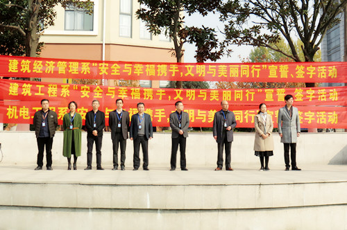 為保障學院學生身心健康,培養學生良好品行,有效預防青少年犯罪,對青少年的不良行為及時進行預防和矯治,建筑經濟管理系、建筑工程系、機電工程系與11月28日中午12:30分聯合組織學生開展了以“安全與幸福攜手,文明與美麗同行”為主題的宣誓、簽名活動。副院長任建設、呂良玉、德育工作部蘇曉紅主任、團委書記陳卓、三系主任、書記及全體學生管理人員參加了此次活動。