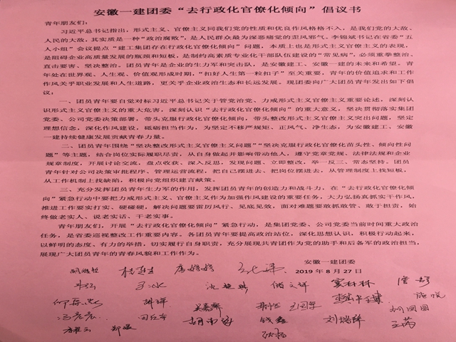 (四)在2019年的“去行政化官僚化傾向”的活動(dòng)中,團(tuán)委組織青年倡議活動(dòng),團(tuán)員青年嚴(yán)格要求自己,不搞形式主義、官僚主義并堅(jiān)決抵制,大力弘揚(yáng)真抓實(shí)干作風(fēng)。同時(shí)各團(tuán)支部組織青年團(tuán)員結(jié)合公司的實(shí)際、自己崗位職責(zé),對(duì)公司的制度文件、審批流程、決策程序、管理制度等方面進(jìn)行討論交流并提出相關(guān)的意見(jiàn)建議。