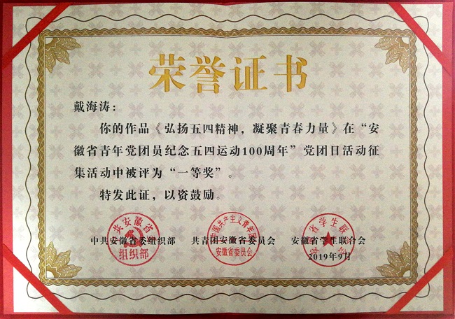 搭建文體活動平臺。今年是五四運動100周年,公司團委著眼新時代青年多層次、多方面、多樣化文化需求,先后組織“傳承五四精神,綻放青春風采”五四青年節活動、“傳承五四精神,緬懷革命先烈”紀念五四運動100周年活動、“青春心向黨,建功新時代”主題的演講征文等重大活動,各級團組織也分別組織了參觀革命圣地、重溫入團誓詞、觀看紅色電影等形式多樣、內容豐富、主題鮮明的文體活動,各類活動給公司青年提供了一個自由開闊的展示平臺,激發了青年員工參與自由創作、展現青春風采的主動性與積極性。其中公司團委選送的作品獲得安徽省“五四運動100周年”紅色信息征集評選活動一等獎。