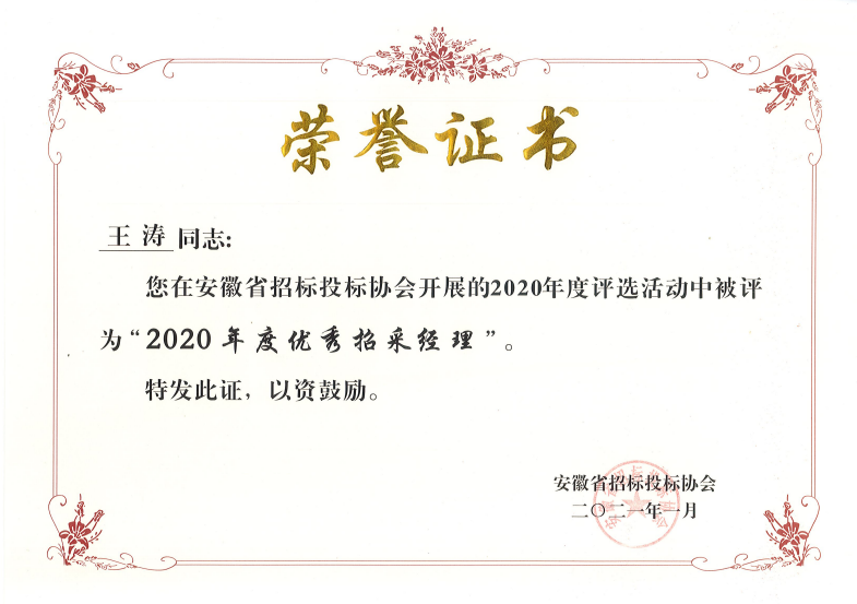 黨員、集團招標中心王濤同志榮獲安徽省招標投標協會評為