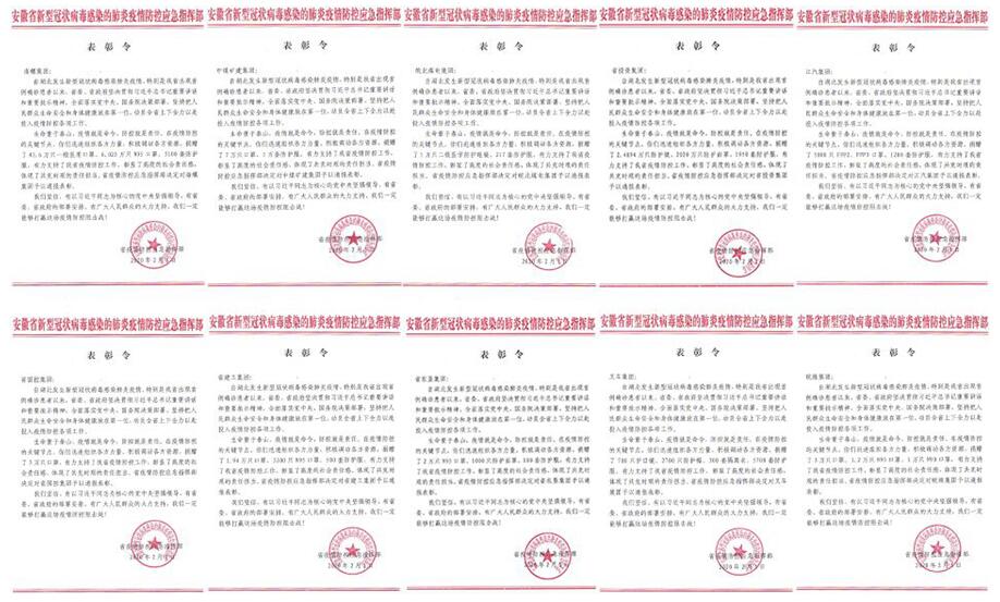 2月1日,省疫情防控應急指揮部對相關省屬企業頒發表彰令,對海螺集團、中煤礦建集團、皖北煤電集團、省投資集團、江汽集團、省國控集團、建工集團、省農墾集團、叉車集團、皖維集團等10戶省屬企業進行了通報表彰。