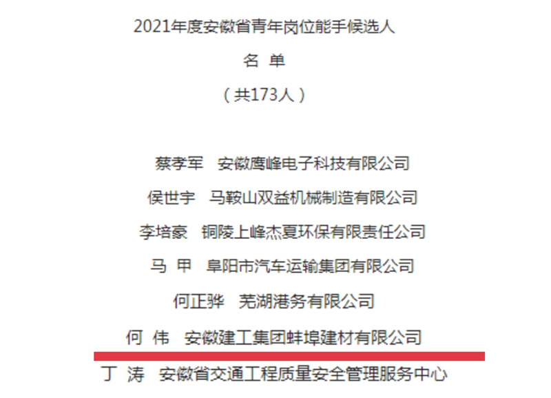 近日,共青團(tuán)安徽省委傳來喜訊,安徽建工建材科技集團(tuán)有限公司職工何偉被授予“2021年度安徽省青年崗位能手”榮譽(yù)稱號(hào)。