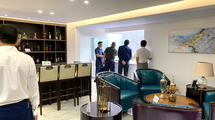 孫總一行首先來到翰林天筑營銷中心,在案場了解項目銷售情況,對高層去化進度表示了肯定,同時期望后續推售的小高層產品再接再厲。在參觀中軸示范區、清水樣板間以及精裝樣板間時,孫總對產品設計與施工質量表示了認可,并要求項目施工管理人員要精雕細鑿,打造一流的產品。