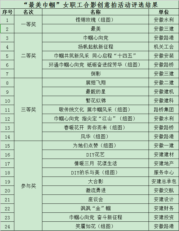 “巾幗心向黨·奮斗新征程”婦女節主題慶祝系列活動,“最美巾幗”女職工合影創意拍評選結果揭曉。本次活動以致敬建黨100周年、巾幗展風采為主題,以團隊創意拍的形式,集中展現建工女職工愛黨愛國愛企的熱情,營造了生動活潑、妙趣橫生的文化氛圍。活動得到了各級工會積極響應,受到女職工們的歡迎,共有來自所屬單位和集團機關的84幅作品參賽,經綜合評選,最終評出一等獎2名,二等獎5名,三等獎7名,評選結果如下: