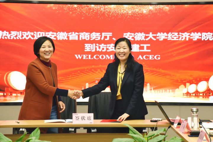 4月7日下午,安徽建工集團股份有限公司與安徽大學經濟學院在安建大廈12樓舉行校企合作簽約儀式。建工股份副總經理、海外事業部黨總支書記、總經理邢應梅、安徽大學經濟學院黨委書記顧廣玲分別代表雙方簽署協議,安徽省商務廳外經處處長孫永彬、建工控股(股份)人力資源部部長朱金蓉出席簽約儀式并講話。安徽大學經濟學院副院長田淑英、華德亞、經濟學院國貿系主任李保民、國貿系國際經濟學教研室主任呂孝能、海外事業部領導班子成員、駐外機構負責人及安徽大學校友代表參加了簽約儀式。