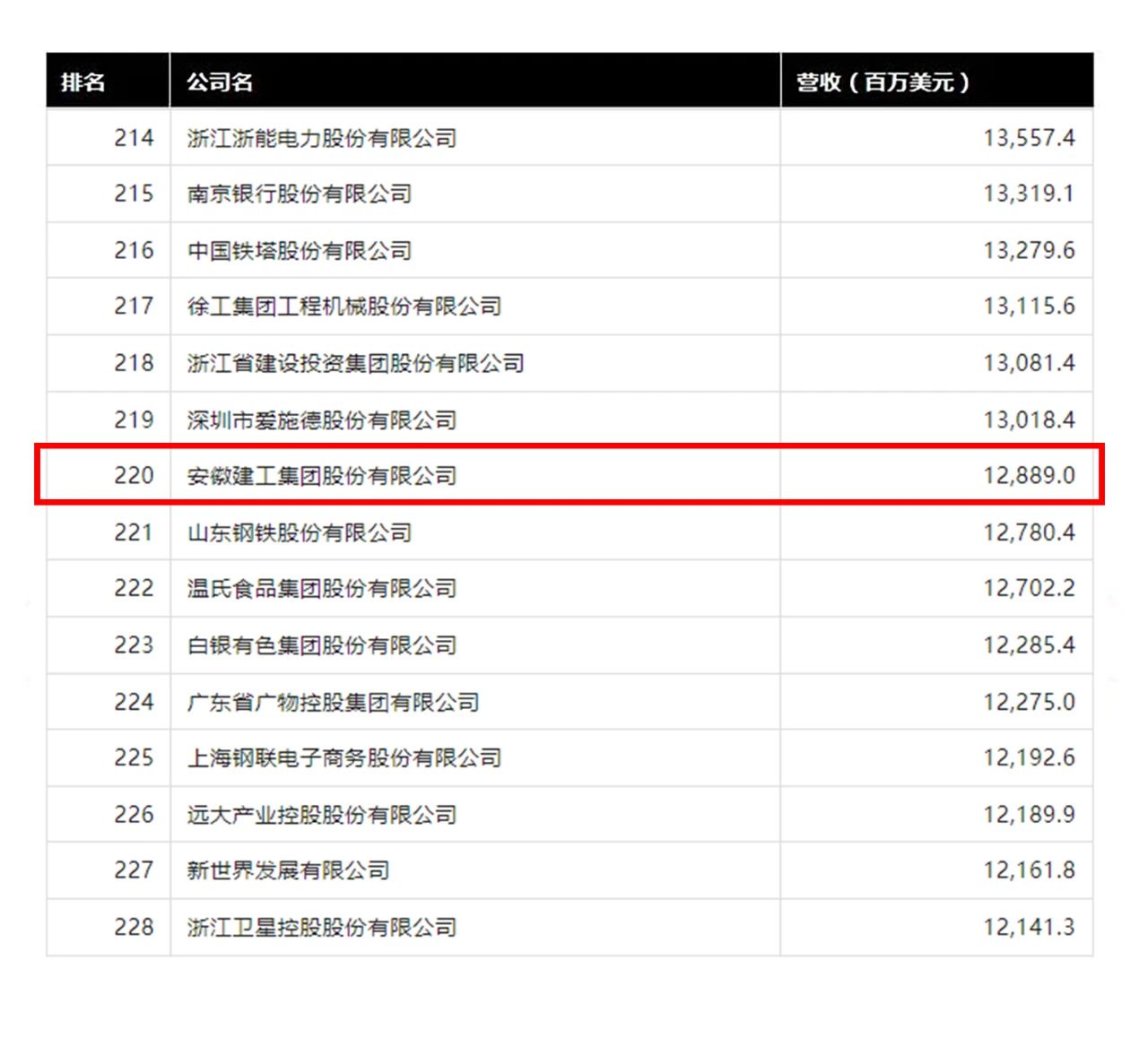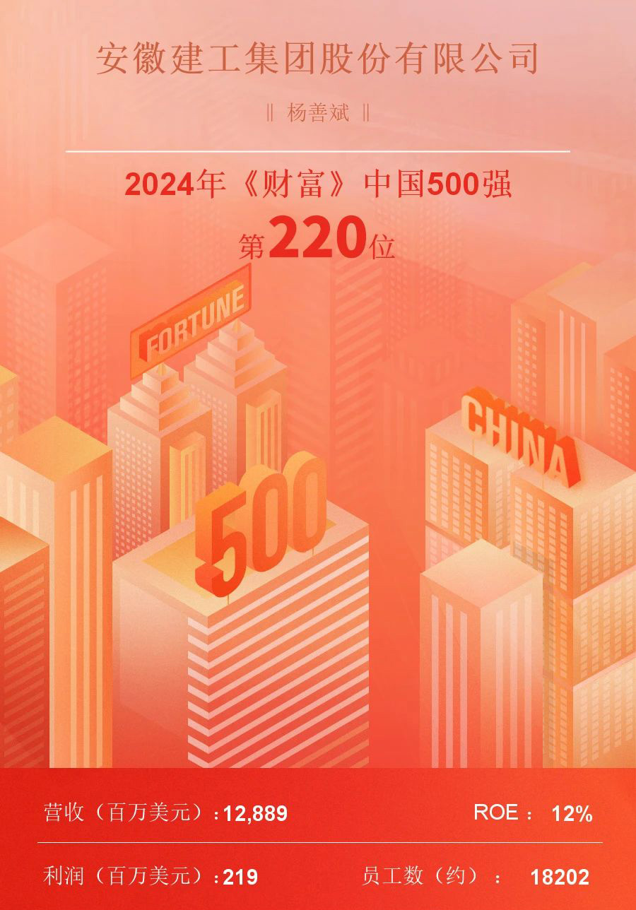 財富Plus APP于北京時間7月25日發(fā)布了2024年《財富》中國500強(qiáng)排行榜。安徽建工集團(tuán)股份有限公司以12,889.0百萬美元的營收名列第220位。