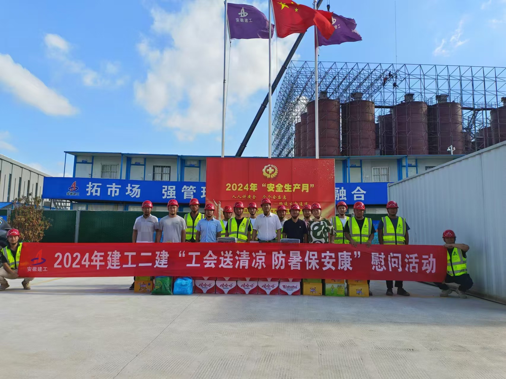 驕陽(yáng)似火,酷暑難耐,為做好職工防暑降溫工作,有效防控高溫中暑事件和安全生產(chǎn)事故的發(fā)生,切實(shí)維護(hù)廣大職工的勞動(dòng)安全和健康,7月25日,建工二建黨委副書(shū)記、總經(jīng)理陶良敬赴安徽建工(蕪湖)新材料智能智造產(chǎn)業(yè)園項(xiàng)目開(kāi)展送清涼慰問(wèn)活動(dòng)。建工建材蚌埠建材公司副經(jīng)理邵亞飛參加慰問(wèn)活動(dòng)。