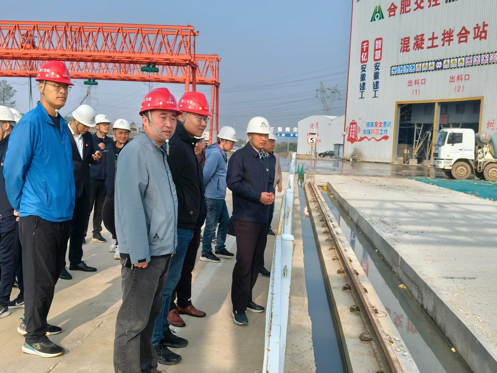 在S18寧合高速4標項目,合肥交投合寧高速公路有限公司黨支部書記黃華一行參觀了拌和站、預制梁場,詳細了解了項目概況、生產進度和重難點工作。S18寧合高速項目黨支部書記、項目經理肖昌樹就梁場布局、施工現狀、節點計劃、機械設備及近期工作安排進行業務匯報,他指出推進“黨建進工地”,是新時代加強基層黨建工作,推動工程項目高質量發展的重要舉措,將黨建工作深入融入工程建設工作中,不僅能提升項目管理的科學化水平,更能激發廣大黨員職工的工作熱情和創造力,為項目工程建設注入強大動力。