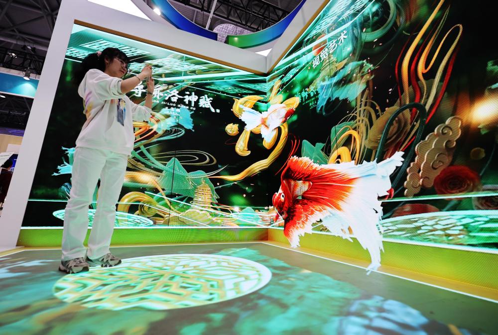 ??2024年4月1日,在安徽合肥舉辦的2024國際顯示技術大會上,一名觀眾體驗京東方展出的裸眼3D快速拆裝折角屏。