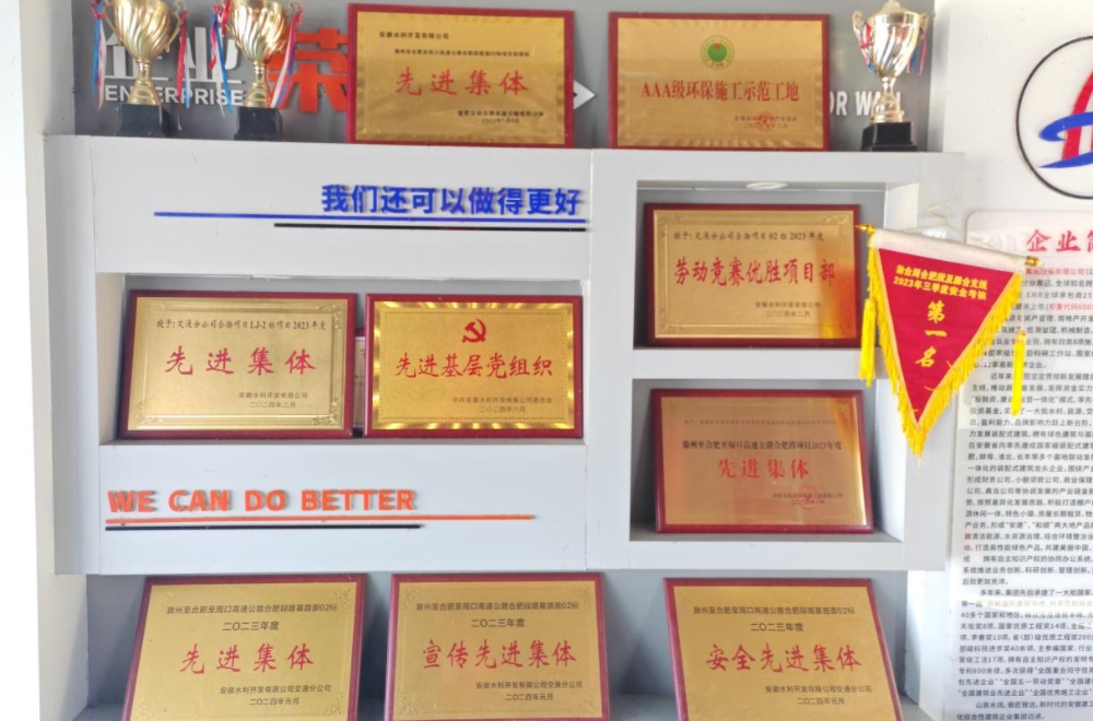 項(xiàng)目先后獲得合肥市交投“2022、2023年度“先進(jìn)集體”榮譽(yù)稱(chēng)號(hào)、安徽建工2024上半年“流動(dòng)紅旗”黨組織項(xiàng)目部、安徽水利“先進(jìn)集體、勞動(dòng)競(jìng)賽優(yōu)勝項(xiàng)目部”“先進(jìn)基層黨組織”等榮譽(yù)稱(chēng)號(hào)。