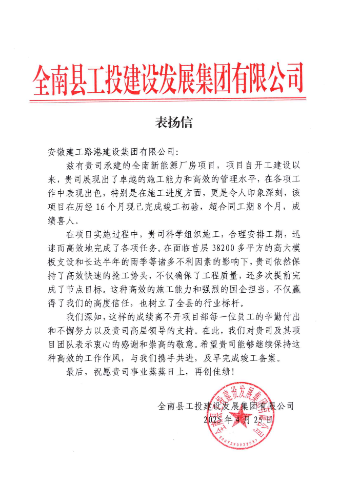 近日,建工路港收到江西省全南縣工投建設(shè)發(fā)展集團(tuán)有限公司發(fā)來的表揚(yáng)信,信中對(duì)公司在全南縣新能源產(chǎn)業(yè)園標(biāo)準(zhǔn)廠房及配套基礎(chǔ)建設(shè)項(xiàng)目中的出色表現(xiàn)予以高度肯定。