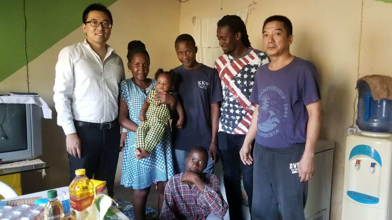 Mr. Bian Yang and Mr. He Bin are posing for a photograph with Mr. Florentino and his family