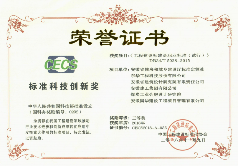 “Standard Science and Technology Innovation Award(Award Code: 0292)”organized by China Engineering Construction Standardization Association is approved by the National Science and Technology Reward Project Office of the Ministry of Science and Technology, aims to further promote the reform of China`s construction engineering standardization and strengthen the standards implementation and standardization achievement transformations, so as to ensure the quality and safety in industry sectors and play to the supports for standard of industrial transformations and upgrading of economic quality and the efficiency of mobilizing the enthusiasm and creativity of standardized workers. In 2018, a total of 10 first awards, 18 second awards and 24 third awards have been awarded nationwide, among which only 6 are local standards and the rest are industrial and national standards.